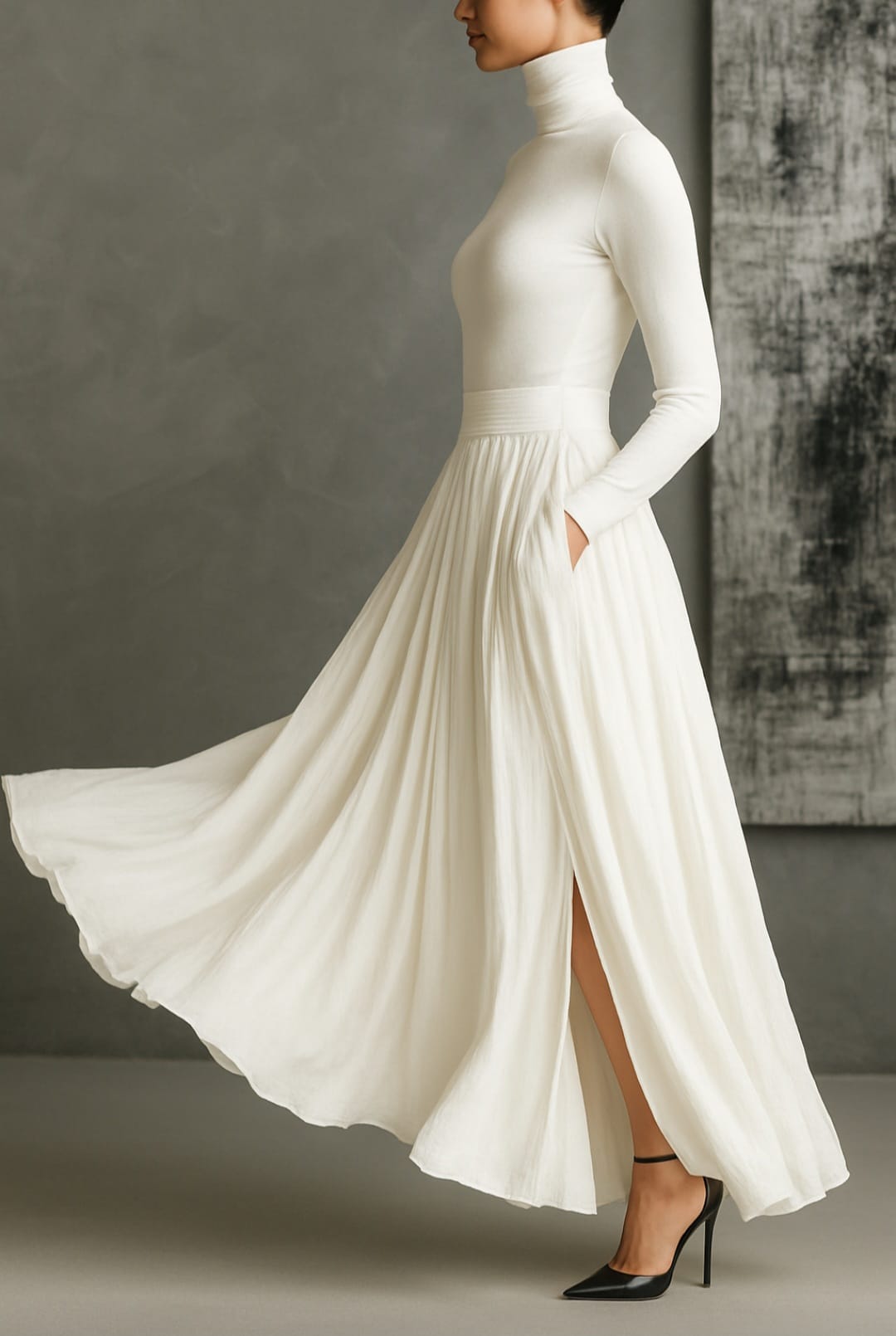 The fitted long-sleeve top contours the body with a smooth, flexible feel, while the high neckline adds an air of refined minimalism. Paired with a voluminous pleated maxi skirt featuring a graceful side slit, the Michaela set moves elegantly with every step.